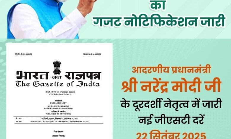 नई दिल्ली। प्रधानमंत्री श्री नरेंद्र मोदी जी के दूरदर्शी नेतृत्व में केंद्र सरकार ने जीएसटी की नई दरों का गजट नोटिफिकेशन जारी कर दिया है। ये नई दरें 22 सितंबर 2025 से पूरे देश में लागू होंगी।