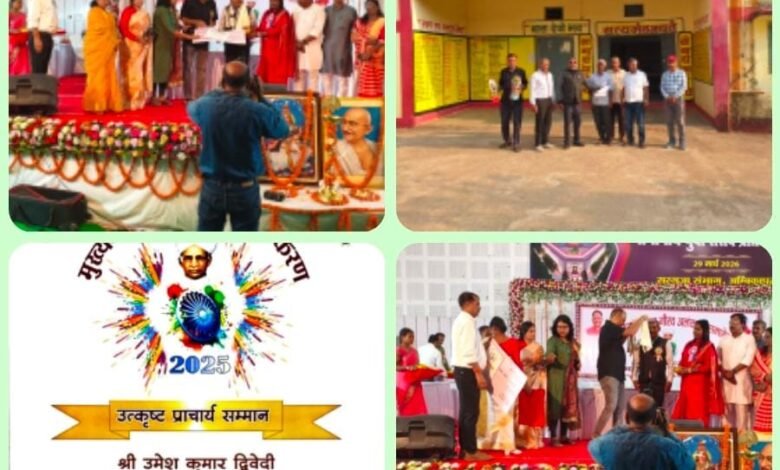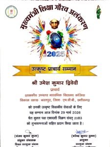 छत्तीसगढ़ प्रदेश के एमसीबी/जनकपुर अंतर्गत शासकीय उच्चतर माध्यमिक विद्यालय कंजिया के प्राचार्य श्री उमेश कुमार द्विवेदी को मुख्यमंत्री शिक्षा गौरव अलंकरण योजना के तहत “शिक्षा श्री” एवं “उत्कृष्ट प्राचार्य” सम्मान से नवाजा गया। यह सम्मान समारोह 29 मार्च 2026 को शासकीय राजीव गांधी स्नातकोत्तर महाविद्यालय, अंबिकापुर के ऑडिटोरियम में गरिमामय वातावरण में आयोजित किया गया।