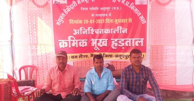 *संयुक्त ठेकेदारी मजदूर यूनियन व मध्यप्रदेश किसान सभा जिला समिति अनूपपुर के आव्हान पर बस स्टैण्ड जैतहरी में विगत 20 जनवरी से अनिश्चित कालीन क्रमिक भूख हड़ताल जारी*
