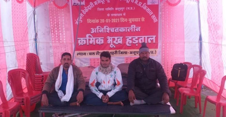 संयुक्त ठेकेदारी मजदूर यूनियन सीटू एवं मध्यप्रदेश किसान सभा जिला समिति अनूपपुर के आव्हान पर बसस्टैण्ड जैतहरी में झमाझम बारिश एवं कड़कड़ाती ठंड से जूझते हुए किसान एवं मजदूरों का क्रमिक भूख हड़ताल जारी है ।