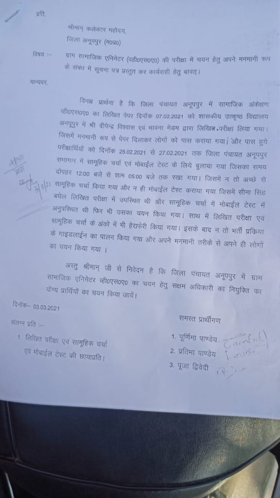 सरोधन सिंह अपर कलेक्टर और मुख्य कार्यपालन अधिकारी अनूपपुर मिलिन्द्र नागदेवे को दिए गए ज्ञापन में शिकायत की गई है कि जैतहरी जनपद पंचायत क्षेत्र के अभ्यर्थियों की मोबाइल टेस्ट , सामूहिक चर्चा और साक्षात्कार की परीक्षा में सीमा सिंह शामिल नही हुई थी वह तय तिथि को अनुपस्थित थी फिर भी उनका चयन उक्त पद के लिए कर दिया गया है ।