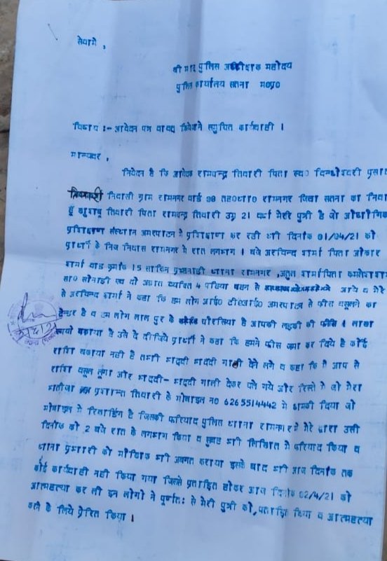 बीती रात 01/04/2021 को लगभग 11.30 बजे चार मानचले आराजक तत्व अरविंद शर्मा अतुल शर्मा जीतेन्द्र शर्मा और उसका एक साथी चारों ने मिलकर खुसबू तिवारी उम्र 23 वर्ष,/ पिता/ रामचन्द्र तिवारी जो आईटीआई की छात्र थी निवासी वार्ड क्रमांक 08 रामनगर के घर के सामने जा कर खुसबू और उसके माता पिता को बहुत ही अपशब्द पूर्ण गंदी गंदी गलिया दी जिससे वो आहत होकर नजरे अपने मां बाप से ना मिला पाने का दर्द सहते हुए सुबह प्रातःकाल फासी लगाकर अपनी इज्जत को लेकर आत्महत्या करली एवं अपनी जीवन लीला समाप्त कर ली
