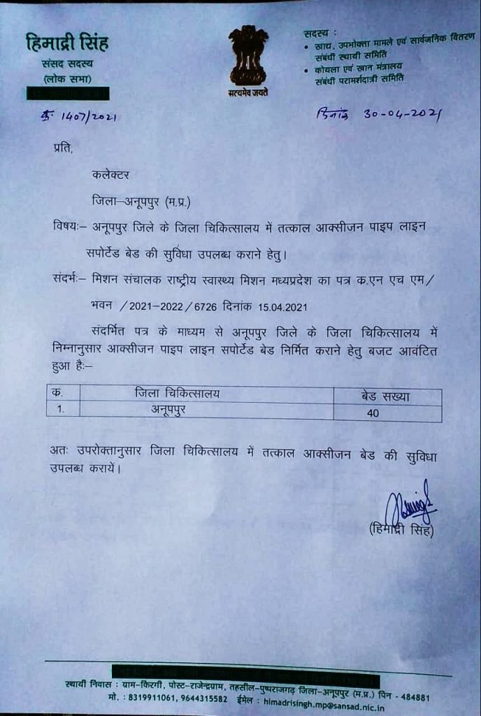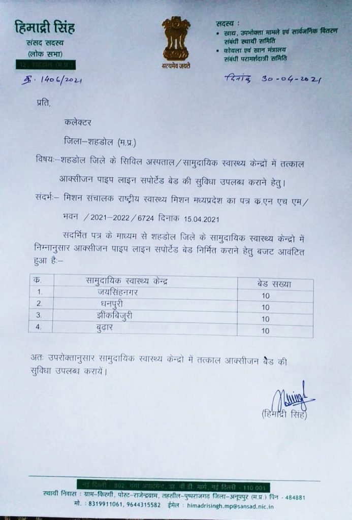 भाजपा नेता मनोज दुवेदी से मिली जानकारी के अनुसार सांसद सिंह ने उक्त जिलों के कलेक्टर्स को पत्र लिख कर कहा है कि अनूपपुर जिला चिकित्सालय में 40 , कोतमा, जैतहरी, फुनगा ,करपा में 10-10, परासी एवं पुष्पराजगढ में 15 – 15 , शहडोल जिला चिकित्सालय में 100 , जयसिंहनगर, धनपुरी, झींकबिजुरी , बुढार में 10-10 , उमरिया जिला चिकित्सालय में 16 एवं पाली 15 ,चंदिया सामुदायिक स्वास्थ्य केन्द्र में 10 ऑक्सीजन स्पोर्टेड बेड विकसित करने व सुविधायुक्त बनाने के लिए की स्वीकृति प्रदान कर बजट आबंटित हुआ है।