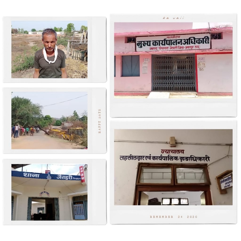 जिला अनूपपुर के जनपद/तहसील/थाना जैतहरी के अंतर्गत आने वाले ग्राम पंचायत ठोंढीपानी में इन दिनों लॉक डाउन का भरपूर फायदा उठाते हुए प्रशासन के नियमों और न्यायालय के आदेश की धज्जियां उड़ाने में कोई कसर नहीं छोड़ी जा रही है। पीड़ित दर-दर भटकते हुए जिस गली भी जा रहा है वहीं से उसको सिर्फ निराशा ही मिल रही है यदि पीड़ित जाए तो जाए कहां और गुहार लगाए तो लगाए कहां। पीड़ित के द्वारा एकमात्र लास्ट स्थान न्यायालय बचा है वह भी लॉकडाउन के समय बंद है और इसी का फायदा उठाते हुए ग्राम पंचायत के सरपंच एवं सचिव ने अपने मनमानी करने की ठान रखी है दूसरी तरफ देखा जाए तो स्टे आर्डर लगाने वाला तहसील और जिम्मेदारी लेकर उसपर कार्य करने वाले प्रशासनिक अमले ने भी इस पर खानापूर्ति जैसा कार्य बखूबी किया है।
