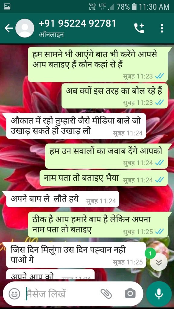 *अमरपाटन :-* अमरपाटन मे एक ऐसी घटना देखी गई है जहाँ पत्रकार ने कोई खबर लगाई और किसी अनजान व्यक्ति के द्वारा सोशल मीडिया प्लेटफार्म ( वाट्सएप ) के माध्यम से धमकी भरे संदेश भेजे जा रहे हैं।