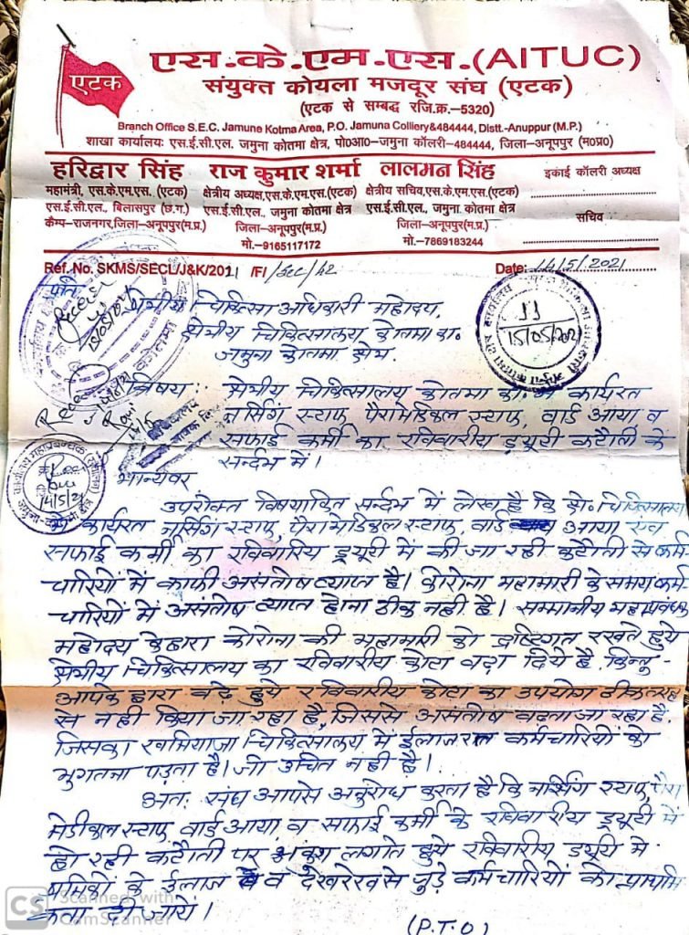 जमुना कोतमा एसईसीएल के जमुना कोतमा क्षेत्र में क्षेत्रीय चिकित्सालय मे कार्यरत फ्रंटलाइन वर्कर जो कि इस करोना काल में अपनी सेवा जान जोखिम में डालकर दे रहे हैं उनके साथ चिकित्सा अधिकारी द्वारा न्याय न करते हुए उनकी रविवारीय ड्यूटी को काटा जा रहा है जो पूरी तरह गलत है इस संबंध में संयुक्त कोयला मजदूर संघ एटक के महामंत्री लालमन सिंह ने क्षेत्रीय चिकित्सा अधिकारी महाप्रबंधक जमुना कोतमा क्षेत्र महा प्रबंधक संचालन क्षेत्रीय कार्मिक प्रबंधक को पत्र लिखकर मांग किया है कि क्षेत्रीय चिकित्सालय में कार्यरत नर्सिंग स्टाफ पैरामेडिकल स्टाफ वार्ड आया एवं सफाई कर्मी का रविवारी ड्यूटी में की जा रही कटौती से कर्मचारियों में काफी असंतोष व्याप्त है