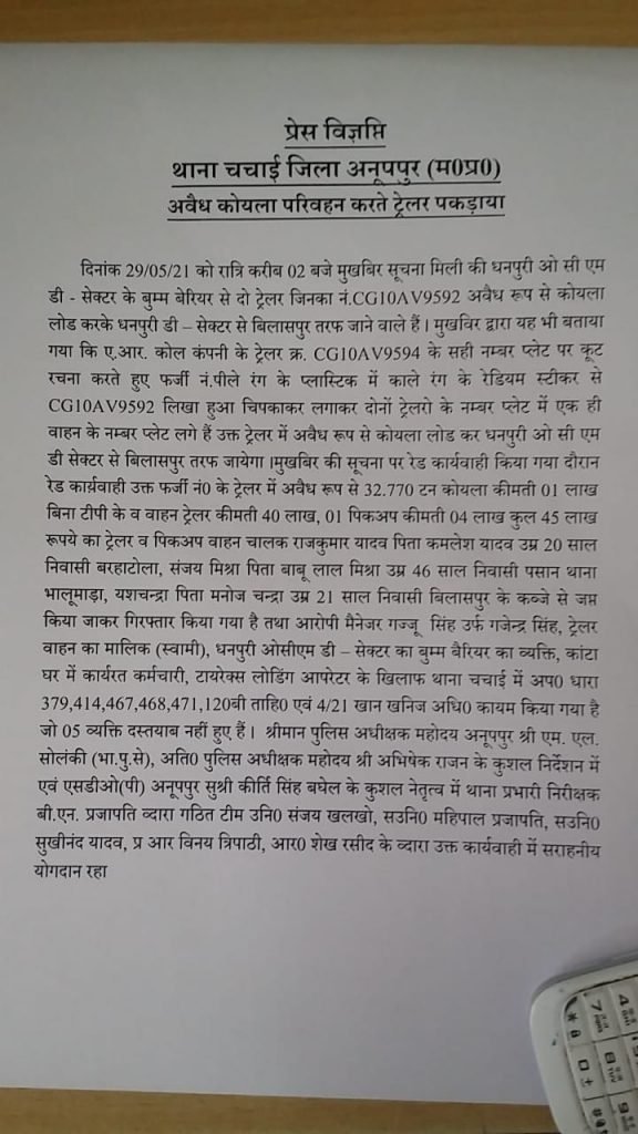 मध्यप्रदेश के शहडोल संभाग में संचालित कोयला खदान में छत्तीसगढ़ राज्य से बिलासपुर निवासी ए आर कोल के संचालक रामजीत सिंह द्वारा धनपुरी ओसीएम से कोयला डिस्पेच का कार्य किया जा रहा था जहां पर कालरी के अधिकारियों से मिलीभगत कर एक नंबर की दो गाड़ी रखते हुए अवैध कोयला परिवहन का कारोबार कई दिनों से किया जा रहा था आज दिनांक 29/5/21कि रात्रि करीब 2:00 बजे मुखबिर द्वारा पुलिस को जानकारी दी गई कि धनपुरी ओसीएम डी-सेक्टर के बूम बैरियर से दो ट्रेलर जिनका वाहन नंबर CG10AV-9592 में अवैध रूप से कोयला लोड करके धनपुरी डी सेक्टर से बिलासपुर जाने वाला है साथ ही मुखबिर द्वारा यह भी बताया गया कि यह वाहन ए आर कोल कंपनी के ट्रेलर नंबर CG10AV-9594 के सही नंबर प्लेट पर कूट रचना करते हुए फर्जी नंबर पीले रंग के प्लास्टिक में काले रंग के रेडियम स्टीकर से CG10AV-9592 लिखा हुआ चिपकाकर लगाया गया था। जहां जांच में दोनों ट्रेलरो में एक ही वाहन के नंबर प्लेट का लगा होना पाया गया।