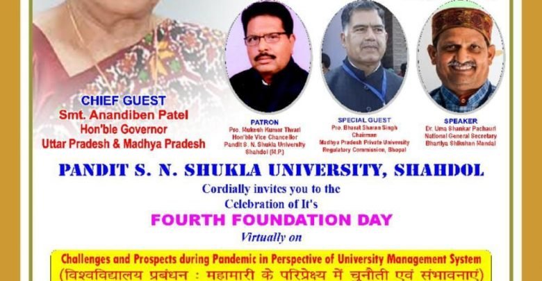 शहडोल / दिन सोमवार दिनांक 31 मई 2021 को उप कुल सचिव पं. शभूनाथ शुक्ला विश्व विद्यालय विनय कुमार सिंह ने बताया कि पं. शभूनाथ शुक्ला विश्व विद्यालय का चौथा स्थापना दिवस 1 जून 2021 को मनाया जाएगा। स्थापना दिवस समारोह में प्रदेश की माननीय राज्यपाल आंनदीबेन पटेल वर्चुअली शिरकत करेंगी। उन्होने बताया कि पं. शभूनाथ शुक्ला विश्व विद्यालय में दोपहर 12.40 बजे से कार्यक्रम आयेाजित होगा। कार्यक्रम में उच्च शिक्षा मंत्री डॉ० मोहन यादव भी वर्चुअली शिरकत करेंगे।