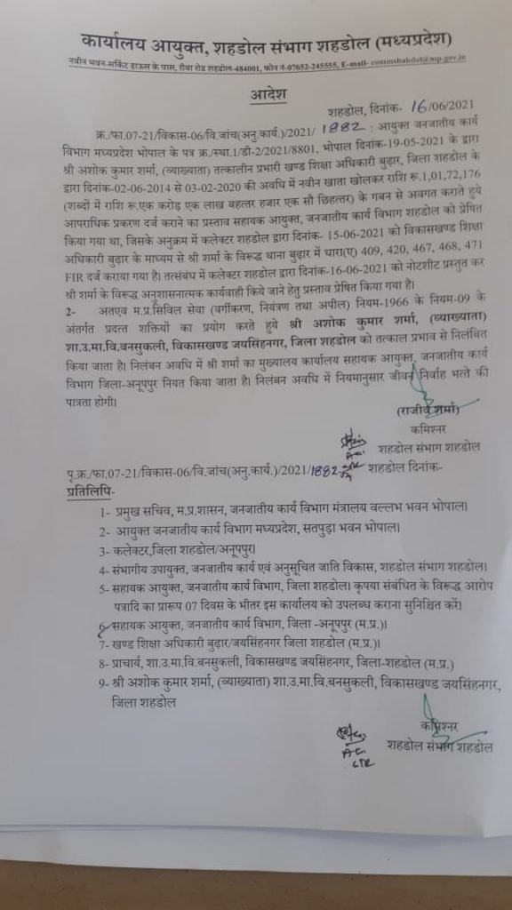 कमिश्नर ने जारी आदेश में कहा है कि आयुक्त जनजातीय कार्य विभाग मध्य प्रदेश भोपाल के पत्र द्वारा व्याख्याता तत्कालीन प्रभारी खंड शिक्षा अधिकारी बुढार जिला शहडोल श्री अशोक शर्मा द्वारा 2 जून 2014 एवं 3 फरवरी 2020 की अवधि में नवीन खाता खोलकर 1 करोड़ 1 लाख 72 हजार 176 रुपए के गबन से अवगत कराते हुए आपराधिक प्रकरण दर्ज कराने का प्रस्ताव सहायक आयुक्त जनजातीय कार्य विभाग शहडोल को प्रेषित किया गया था। जिसके अनुक्रम में कलेक्टर शहडोल द्वारा बीते दिन मगंलवार दिनांक 15 जून 2021 को विकास खंड शिक्षा अधिकारी बुढार के माध्यम से शर्मा के विरुद्ध थाना बुढार में धारा धारा (ए) 409, 420, 467, 468, 471 एफआईआर दर्ज कराया गया है। तत्संबंध में कलेक्टर शहडोल द्वारा दिन बुधवार दिनांक 16 जून 2021 को नोटशीट प्रस्तुत कर शर्मा के विरुद्ध अनुशासनात्मक कार्यवाही किए जाने हेतु प्रस्ताव प्रेषित किया गया है।