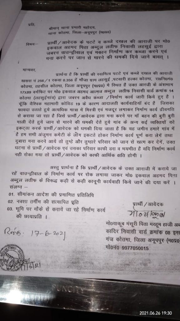 पीड़ित मोहम्मद याकूब मंसूरी पिता मरहूम हाजी अब्दुल कादिर निवासी वार्ड क्रमांक 8 इस्लामगंज द्वारा दिनांक 17 .6.2021 को कोतमा थाने में लिखित शिकायत करते आरोप लगाया प्रार्थी की स्वामित्व पट्टे एवं कब्जे दखल की आराजी खसरा नंबर 256/2 रकवा 0.3 56 हेक्टेयर मौजा ग्राम लहसुन पटवारी हल्का कोतमा रा.नि.म. कोतमा तहसील कोतमा जिला अनूपपुर मध्यप्रदेश में स्थित है, आराजी के अंश भाग 17X89 वर्ग फीट पर मोहम्मद इकबाल अहमद पिता अब्दुल लतीफ निवासी वार्ड क्रमांक 14 लहसुई गांव कोतमा द्वारा ईदगाह के इर्द गिर्द पटवारी की भूमि पर अवैध कब्जा जबरन किया जा रहा है पट्टा धारी भूस्वामी के मना करने के बाद भी उक्त भूमि पर निर्माण कार्य जारी किया जा रहा है ।