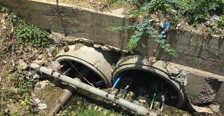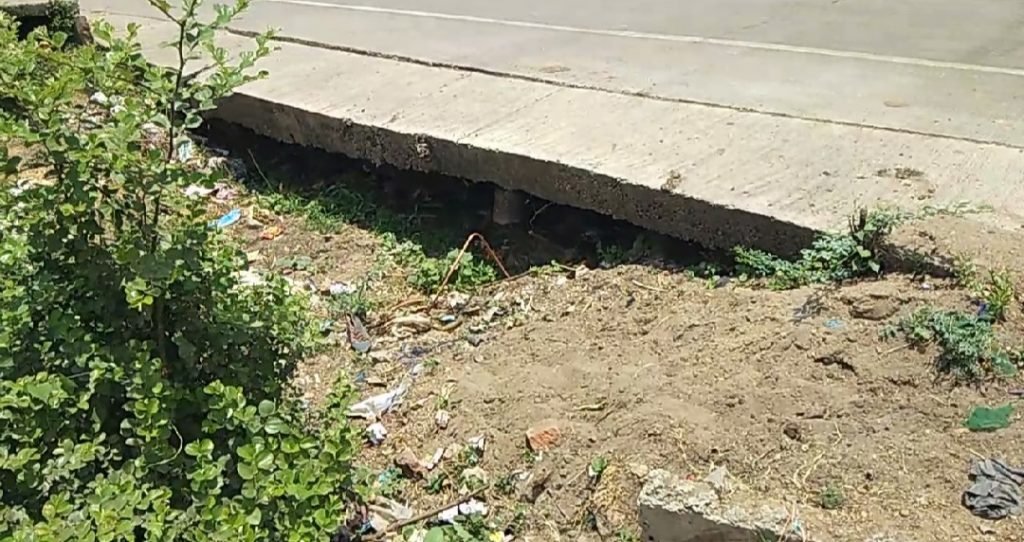 राज मोहब्बत घर के समीप बनी पुल के अंदर मलवा जाम हो जाने के कारण पानी निकासी ना होने पर पानी पुल के समीप ही एकत्रित हो गया जिससे पुल धीरे धीरे कमजोर होकर किनारे से घसक कर बैठ गई है