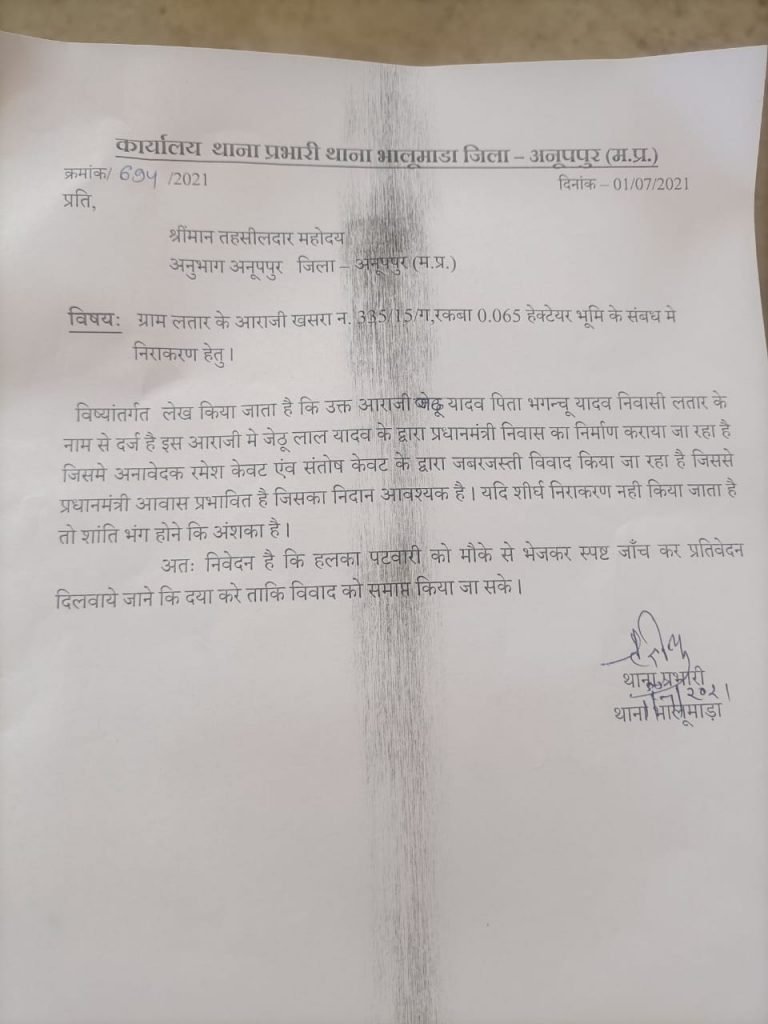 जमुना कोतमा अनूपपुर जिले के थाना भालूमाडा़ के अंतर्गत ग्राम पंचायत लतार में एक गरीब परिवार द्वारा अपना पुश्तैनी कच्चा मकान तोड़कर उसी जगह पर प्रधानमंत्री आवास का निर्माण किया जा रहा था लेकिन गांव के ही कुछ दबंग लोगों ने अपनी दबंगई उक्त कार्य पर रोक लगा दिया और मारपीट व गाली-गलौज करने लगे जिसको लेकर पीड़ित परिवार न्याय की आस में थाना भालूमाड़ा पहुंचकर लिखित रिपोर्ट दर्ज कराई