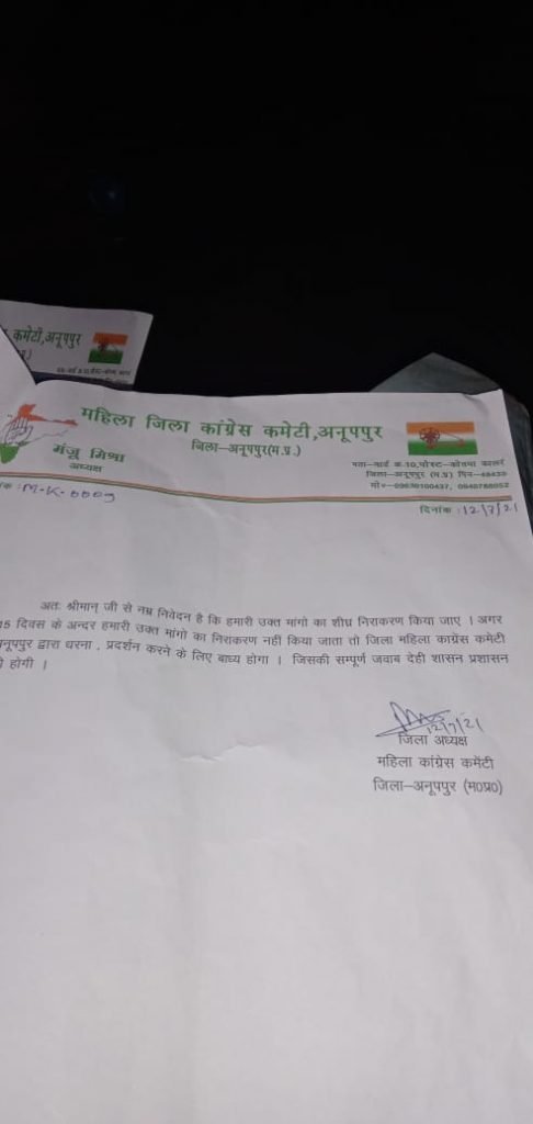 अनूपपुर/अनूूपपुर जिला महिला कांग्रेस कमेटी के अध्यक्ष मंजू मिश्रा के नेतृत्व में कांग्रेस जनों ने अनूपपुर पहुंची मध्यप्रदेश शासन की मंत्री एवं जिले की प्रभारी मंत्री सुश्री मीना सिंह को बढ़ती महंगाई को लेकर एक ज्ञापन सौपी जिला महिला कांग्रेस कमेटी के द्वारा ज्ञापन में जो मांगे उल्लेखित की गई उनमें प्रमुख रूप से पेट्रोल, डीजल के बढ़ते दाम से परेशानी- भाजपा सरकार द्वारा पेट्रोल और डीजल के दामों में लगातार बेतहासा मूल्य वृद्धि से आम नागरिकों के जीवन को आर्थिक परेशानी में डाल दिया है।