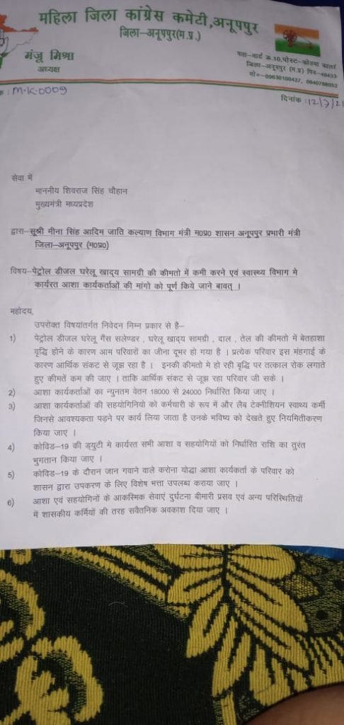 जिला महिला कांग्रेस कमेटी की अध्यक्ष मंजू मिश्रा ने जिले की प्रभारी मंत्री मीना सिंह को ज्ञापन सौंपते हुए अनुरोध किया है कि मध्यप्रदेश सरकार से पेट्रोल डीजल की बढ़ी कीमतों को कम करने बिजली कटौती को दूर करने एवं रेत के सहज उपलब्धता एवं सही रेट आमजन को दिलाने की कृपा करें।जिला महिला कांग्रेस कमेटी द्वारा प्रभारी मंत्री सुश्री मीना सिंह को ज्ञापन सौंपते समय जिला कांग्रेस कमेटी के अध्यक्ष फुन्देलाल सिंह मार्को, सुनील शराब विधायक कोतमा मनोज सराफ अंगा सरोज लोधी सुषमा गुप्ता शबनम खान सरिता सोनी सुलेखा यादव शोभा सिंह सुषमा सावित्री आशा वर्मा पार्षद राधा शहीदा पिंकी प्रजापति गरिमा सिंह चंदा राठौर संध्या वर्मा कमला सिंह सिंगर सुमन राय क्षमा सिंह रंजीता चौहान राज तिवारी, चंद्रभूषण त्रिपाठी, सत्येंद्र स्वरूप दुबे, यूथ कांग्रेस अध्यक्ष गुड्डू चौहान, यूवा कांग्रेस विधानसभा अध्यक्ष आशुतोष सिंह राघवेन्द्र पटेल, उत्तम पटेल, मनोज पटेल, सेवादल यूथ अध्यक्ष जितेन्द्र सोनी, भूरा यादव, चंदन सिंह, प्यारेलाल सिंह, पूर्व नगरपालिका अध्यक्ष राम खेलावन राठौर, रियाज मंसूरी, विनय कांत प्रजापति आदि कांग्रेस जन सहित महिला कांग्रेस की सदस्य उपस्थित रही।