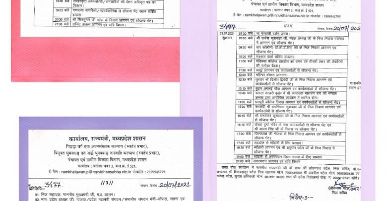 23 जुलाई 2021 को शहडोल जिले के प्रभारी मंत्री राम खेलावन पटेल प्रातः 7:30 बजे मां कंकाली दर्शन अंतरा, प्रातः 8:30 बजे राकेश कुशवाहा के निज निवास आगमन एवं सौजन्य भेंट, प्रातः 9:30 बजे राव कॉलोनी डॉ.जी डी सिंह के निज निवास आगमन एवं सौजन्य भेंट, प्रातः 10:00 बजे सर्किट हाउस में पत्रकार वार्ता, प्रातः 11:00 बजे से मेडिकल कॉलेज शहडोल का भ्रमण एवं कोरोना संक्रमण की तीसरी लहर के संबंध में समीक्षा बैठक करेंगे, प्रातः 11:30 बजे जमुई आगमन एवं कार्यकर्ताओं से सौजन्य भेंट, दोपहर 12:00 बजे महिंद्रा शोरूम आगमन, दोपहर 12:30 बजे धुरवार दिलीप द्विवेदी के निज निवास आगमन एवं कार्यकर्ताओं से सौजन्य भेंट, दोपहर 1:10 बजे बुढार अमलाई चौक आगमन एवं कार्यकर्ताओं से सौजन्य भेंट, 1:40 बजे रूगंटा कालरी बुढार कामाख्या राय के निजी निवास एवं कार्यकर्ताओं से सौजन्य भेंट, दोपहर 2:30 बजे धनपुरी कॉलेज तिराहा आगमन एवं कार्यकर्ताओं से सौजन्य भेंट, दोपहर 3:00 बजे तक करकटी राम निवास कुशवाहा के निजी निवास आगमन एवं सौजन्य भेंट, 3:15 बजे राम शंकर कुशवाहा के निज निवास आगमन एवं सौजन्य भेंट, दोपहर 4:10 बजे खैरहा दुर्गा मंदिर के पास कार्यकर्ताओं से सौजन्य भेंट एवं अजय सिंह के निवास पर सौजन्य भेंट, शाम 5:00 बजे जिलाध्यक्ष भाजपा के निज निवास आगमन एवं कार्यकर्ताओं से सौजन्य भेंट, शाम 5:30 बजे शहडोल से ब्यौहारी के लिए प्रस्थान करेंगे एवं शाम 6:30 बजे ब्यौहारी आगमन एवं शत्रुघ्न पटेल के निजी निवास में सौजन्य भेंट एवं शाम 7:00 बजे ब्यौहारी से अमरपाटन के लिए प्रस्थान कर जाएंगे।