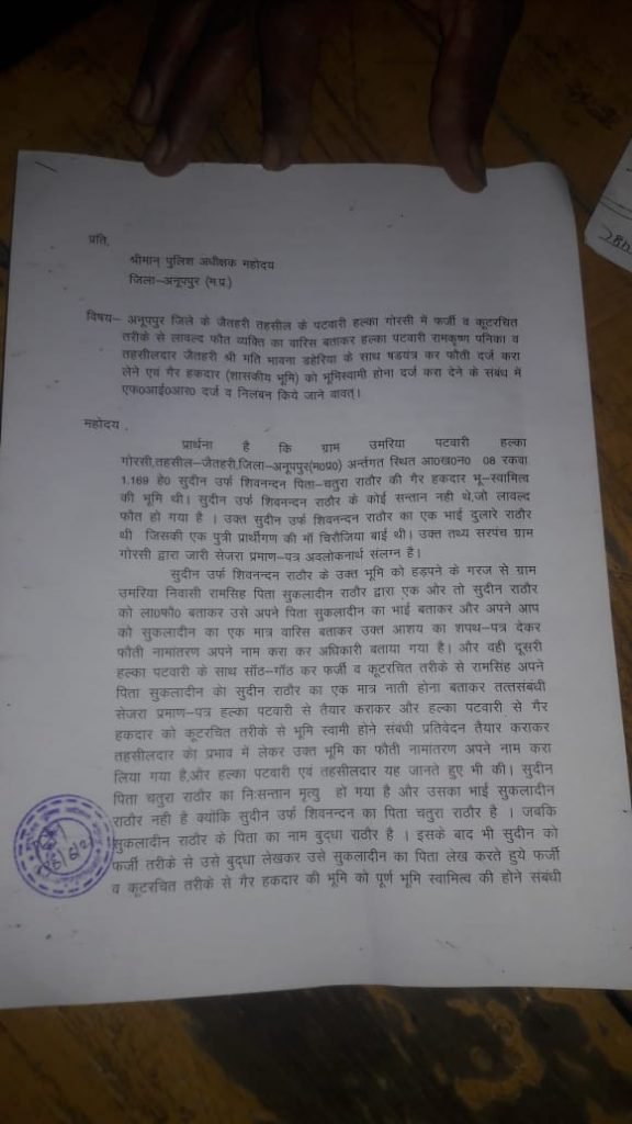 प्रार्थिया गीता बाई राठौर ने पुलिस अधीक्षक अनूपपुर के समक्ष लिखित शिकायत करते हुए बताया कि अनूपपुर जिले के तहसील जैतहरी के पटवारी हल्का गोरसी में फर्जी व कूटरचित तरीके से ला लावल्द फौत व्यक्ति का वारिस बता कर हल्का पटवारी रामकृष्ण पनिका एवं तहसीलदार जैतहरी भावना डहेरिया के साथ षड्यंत्र कर फौजी दर्ज करा लेने एवं गैर हकदार (शासकीय भूमि) को भूमि स्वामी होना दर्ज करा देने के संबंध में एफ आई आर दर्ज करते हुए निलंबन किए जाने के संबंध में लिखित शिकायत की। जिसमे बताया जा रहा है कि यह भूमि सुदीन उर्फ शिवनंदन पिता चतुरा राठौर की गैर हकदार भू स्वामित्व की भूमि थी, सुदीन के कोई संतान नहीं थे जो लावाल्द फौत हो गया है। दूसरी ओर के दिन राठौर का एक भाई दुलारे राठौर था जिसकी एक पुत्री प्रार्थी गण की मां चिरौजिया बाई थी। सरपंच द्वारा इसकी पुष्टि भी सेजरा प्रमाण पत्र द्वारा किया गया है वहीं एक ओर पूरे कागजातों में इसकी टोपी उसके सर और उसकी टोपी इसके सर अर्थात पिता को कहीं पुत्र तो कहीं जबरन वारिस बनाने का कार्य किया गया है जिसपर प्रार्थिया द्वारा कार्यवाही कि मांग की गई है।