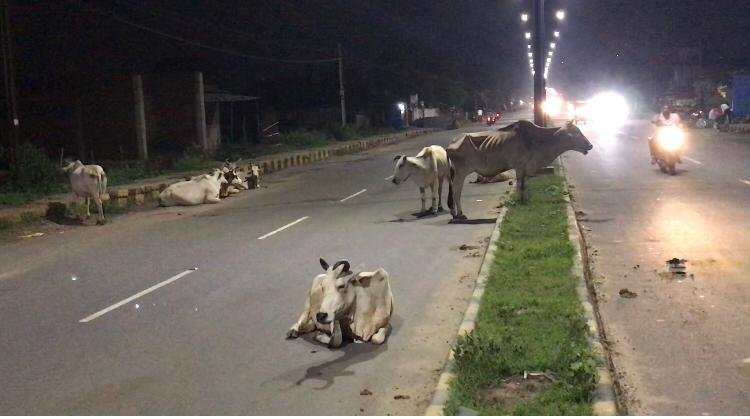 सड़क पर आवारा पशुओं का जमावड़ा देता है दुर्घटना को आमंत्रण