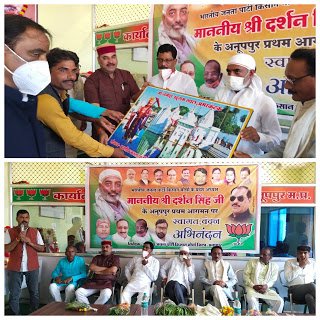 भारतीय जनता पार्टी किसान मोर्चा के प्रदेश अध्यक्ष दर्शन सिंह 6 अगस्त 2021 को अनूपपुर जिले के प्रवास पर पहुंचे जहां पर उन्होंने सर्वप्रथम किसान मोर्चा के कार्यकर्ता और पदाधिकारियों की बैठक लीl इसके पश्चात उन्होंने मीडिया से प्रेस वार्ता के दौरान केंद्र और प्रदेश सरकार द्वारा किसानों द्वारा चलाई जा रही तमाम जनकल्याणकारी नीतियों की जानकारी से अवगत कराया इस दौरान भाजपा जिला अध्यक्ष बृजेश गौतम भाजपा के पूर्व विधायक प्रदेश कार्यसमिति सदस्य रामलाल रौतेल किसान मोर्चा के जिला अध्यक्ष ज्ञानेंद्र सिंह परिहार किसान मोर्चा के प्रदेश कार्यसमिति सदस्य उमेश पटेल विजय राठौर जिला कार्यालय मंत्री चंद्रिका द्विवेदी जिला मीडिया प्रभारी राजेश सिंह उपस्थित रहेl प्रदेश अध्यक्ष दर्शन सिंह जिले के विभिन्न क्षेत्रों से आए किसानों को बैठक के दौरान संबोधित करते हुए कहा कि केंद्र की नरेंद्र मोदी सरकार किसानों के हित में कानून बना रही है अन्य राजनीतिक दल उसका विरोध कर रहे हैं