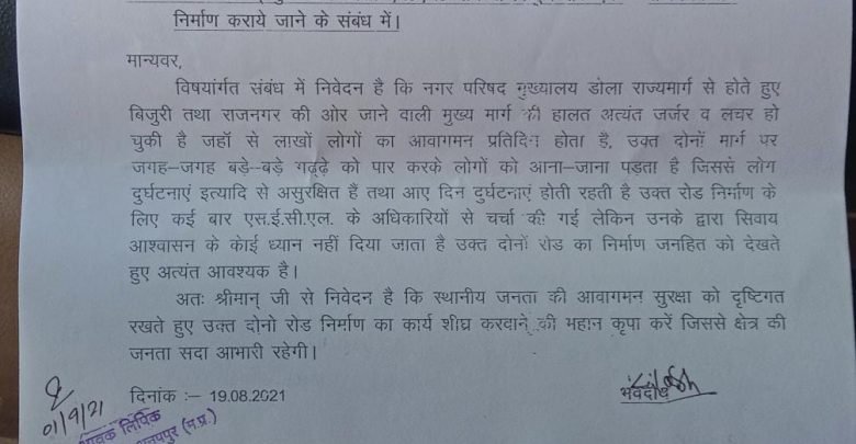 नगर परिषद् मुख्यालय डोला एन.एच.मार्ग से बिजुरी रोड एवं निर्माण कराये जाने के संबंध में मंडलम अध्यक्ष विकास पांडेय के मार्ग दर्शन पर सेक्टर अध्यक्ष डोला कैलाश अहिरवार ने डोला राज्यमार्ग से होते हुए बिजुरी तथा राजनगर की ओर जाने वाली मुख्य मार्ग की स्थिति को सुधारने की मांग को लेकर ज्ञापन दी गई की नगर परिषद मुख्यालय डोला राज्यमार्ग से होते हुए बिजुरी तथा राजनगर की ओर जाने वाली मुख्य मार्ग की हालत अत्यंत जर्जर व लचर हो चुकी है जहाँ से लाखों लोगों का आवागमन प्रतिदिन होता है उक्त दोनों मार्ग पर जगह-जगह बड़े-बड़े गढ़ढ़े को पार करके लोगों को आना-जाना पड़ता है जिससे लोग दुर्घटनाएं इत्यादि से असुरक्षित हैं तथा आए दिन दुर्घटनाएं होती रहती है।