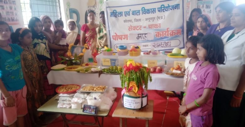 महिला बाल विकास अधिकारी मंजूषा शर्मा के मार्गदर्शन में कोतमा राजनगर, डोला सेक्टरों के अंतर्गत प्रत्येक आंगनबाड़ी केंद्रों में 1 सितंबर से 30 सितंबर तक सप्ताह बार राष्ट्रीय पोषण माह- कार्यक्रम का आयोजन किया जा रहा है जहाँ 7 सितंबर को सेक्टर चाका के आंगनवाड़ी केंद्र खमरौध मे पोषण थाली प्रदर्शन पोषण संवाद कार्यक्रम का आयोजन किया गया एवं व्यंजनों की प्रदर्शनी लगाते हुए उसके महत्व को बताया गया। सेक्टर सुपरवाइजर चिंती घोरमारे ने जानकारी देते हुए कहा कि पांच वर्ष से कम आयु के बच्चों में व्याप्त रोग एवं मृत्युदर कुपोषण का एक प्रमुख कारण है