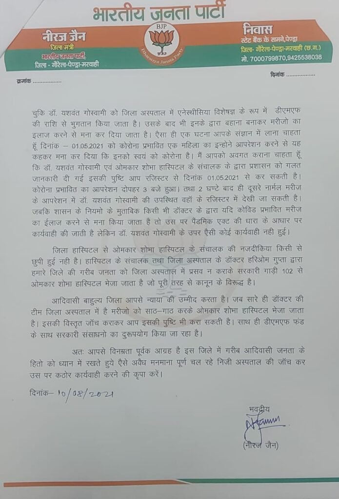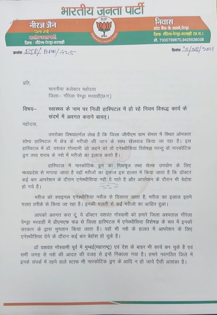 अनूपपुर पेंड्रा गौरेला जिला मंत्री नीरज जैन द्वारा प्रशाशन को दिनांक 10/8/2021 को पत्र द्वारा अवगत कराया गया था, की निजी हॉस्पिटल नियम विरूद्ध कार्य कर रहा है, जिसमे ओंकार शोभा हॉस्पिटल,के डॉक्टर के बारे में ये बताया था,की कार्य के दरमियान नारकोटिक उपयोग करते तथा आपने कार्य के दौरान कई बार नसे की हालत में रहने की वजह से बेहोश हो कर गिर पड़े है।