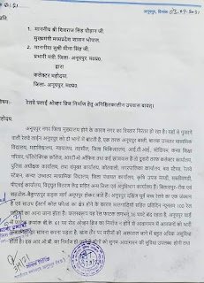जिला मुख्यालय अनूपपुर में फाटक की समस्या खत्म होने का नाम नही ले रही है जब हमने जिला मुख्यालय में आम जनता से इस बारे में जानने की कोशिश किये तो नाम न छापने पर लोग खुलकर बोले कि कई वर्षों से भोले भाले जनता को केवल आश्वासन का झुनझुना पकड़ा दिया जाता है काफी दिनों के बाद कुछ लोग जाग जाते है और अपने खोते हुए जनाधार को फिर से वापसी करने के लिए अपनी नेतागिरी चमकाने के लिए अपने ही सरकार के खिलाफ विरोध करने का नया ड्रामा खेला जा रहा हैं अपनी ही सरकार के खिलाफ जाकर क्या सिद्ध करना चाहते है कि ये लोग ही जनता के असली हमदर्द है इसी कड़ी में अनूपपुर रामलाल रौतेल मुख्यमंत्री शिवराज सिंह चौहान जी, सुश्री मीना सिंह प्रभारी मंत्री अनूपपुर के नाम कलेक्टर महोदया अनूपपुर के द्वारा एक ज्ञापन सौप कर रेलवे फ्लाई ओव्हर ब्रिज निर्माण हेतु अनिश्चितकालीन उपवास पर बैठने का निर्णय लिया है।