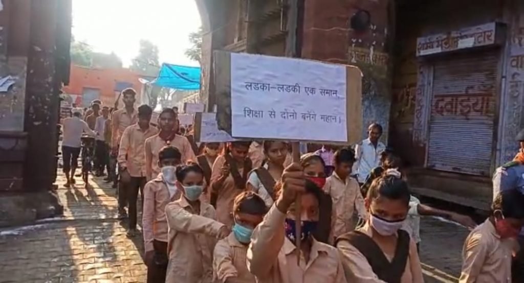 इस दौरान बच्चे हाथों में विधिक जागरूक करने वाली तख्तियां लेकर चल रहे थे।