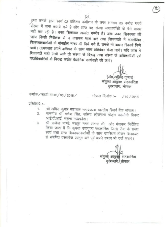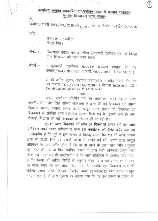 रिलायबल क्रेडिट को ऑपरेटिव सोसाइटी कंपनी के विरुद्ध कार्यालय आयुक्त सहकारिता एवम पंजीयक सहकारी संस्था के संयुक्त आयुक्त भोपाल से शिकायत मिलने के बाद फर्म एवम सोसाइटी उपायुक्त,रीवा को जांच के निर्देश दिए गए जांच उपरांत उपायुक्त रीवा ने रिलायबल क्रेडिट को ऑपरेटिव सोसाइटी कंपनी के संचालक द्वारा उपभोक्ताओं के साथ जालसाजी करने के साक्ष्य पाए गए