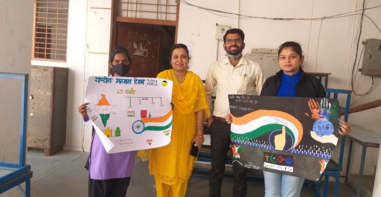 महाविद्यालयीन छात्रों ने स्लोगन के साथ चित्र बना दिया मतदाता जागरूकता का संदेश