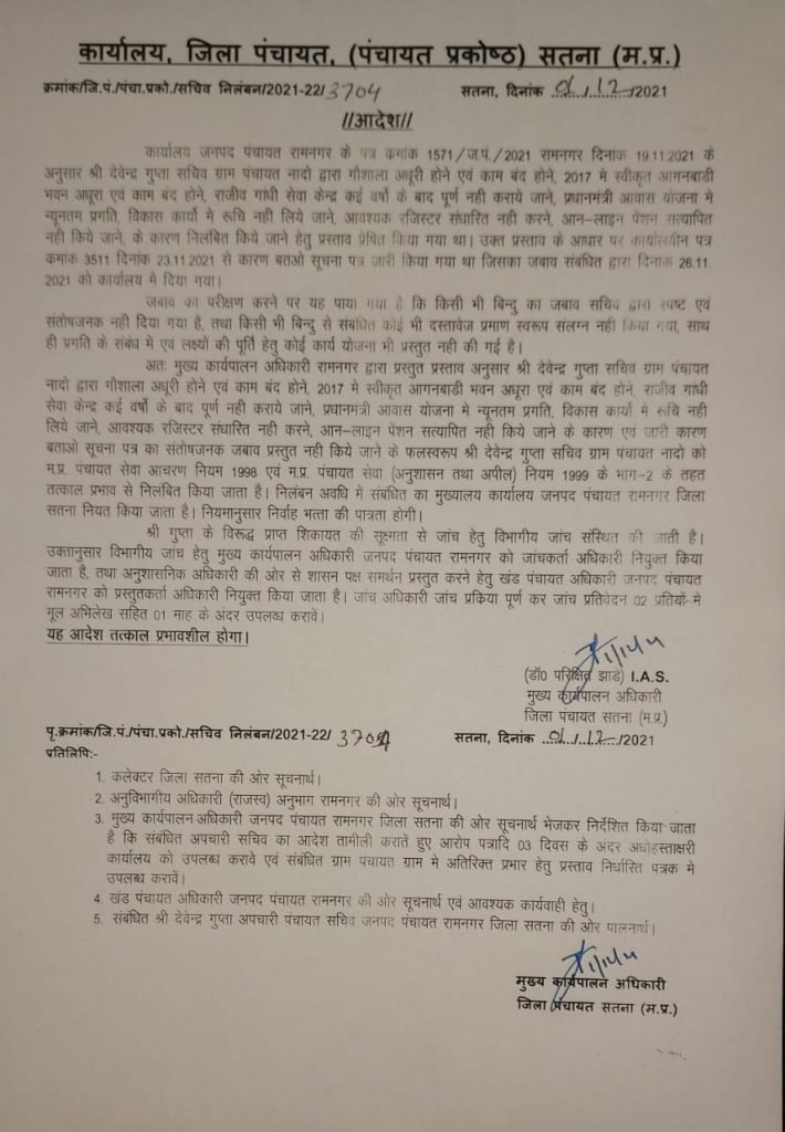 सचिव अवधेश पटेल के कार्य प्रगति ना होने के कारण पत्र क्रमांक 3510 दिनांक 2211 2021 नोटिस जारी कर जवाब मांगा गया जिसमें जब आप 26 11 2021 को जनपद कार्यालय में प्रेषित होकर बिंदुवार जांच करने के बाद स्पष्ट संतोषजनक जानकारी ना देने पर अवैधानिक शासन के पैसे की राशि आहरण करने पर सेवा आचरण नियम 1998 अनुशासन तथा अपील नियम 1999 के भाग 2 के तहत तत्काल प्रभाव से निलंबित दिनांक 1,12, 2021 को प्रभार ग्राम पंचायत देवरा मोलहाई से हटाकर जनपद कार्यालय अटैच किया गया