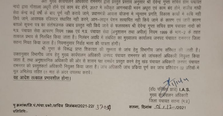 मध्य प्रदेश सतना जिला के अंतर्गत रामनगर ब्लॉक पदस्थ नादो सचिव देवेंद्र गुप्ता के द्वारा प्रधानमंत्री आवास स्वीकृत 2017 में , आंगनवाड़ी भवन , गौशाला एवं ऑनलाइन पेंशन सत्यापित और राजीव गांधी सेवा केंद्र कई वर्षों से शासन की आदेशा अनुसार पूर्ण ना होने पर जनपद पंचायत रामनगर दिनांक 19 11 2021 की बैठक पत्र क्रमांक 1571 के अनुसार जिला सी ई ओ को जानकारी भेजने पर जिला सी ई ओ मामले को संज्ञान में लेते हुए सचिव देवेंद्र गुप्ता