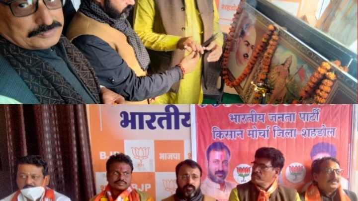शहडोल /किसान दिवस के शुभ अवसर पर शहडोल जिले मे भाजपा जिला अध्यक्ष कमल प्रताप सिंह के मार्गदर्शन मे किसान मोर्चा जिला अध्यक्ष रवि कांत त्रिपाठी के द्वारा जिला किसान मोर्चा कार्यकारिणी के जिला पदाधिकारी जिला कार्यसमिति के सदस्यगण मंडल के मंडल अध्यक्षो की बैठक की गयी। दिन शुक्रवार दिनांक 23 दिसंबर 2021 को किसान दिवस के शुभ अवसर पर परिचय मिलन बैठक जिला भाजपा कार्यालय शहडोल में रखा गया ।बैठक की शुरुआत भारत माता के चरणों में एवं भाजपा के प्रणेता पंडित दीनदयाल उपाध्याय ,डॉक्टर श्यामा प्रसाद मुखर्जी के चरणों में पुष्प अर्पण दीप प्रज्वन कर हुई। सभी किसान मोर्चा के पदाधिकारीयो ने भाजपा जिला अध्यक्ष कमल प्रताप सिंह, शीतल पोद्दार किसान मोर्चा प्रभारी, किसान मोर्चा जिला अध्यक्ष रविकांत त्रिपाठी का पदाधिकारीयों ने स्वागत किया वही भाजपा जिला अध्यक्ष कमल प्रताप सिंह को किसान मोर्चा के जिला एवं मंडल के पदाधिकारियों द्वारा परिचय दिया गया।