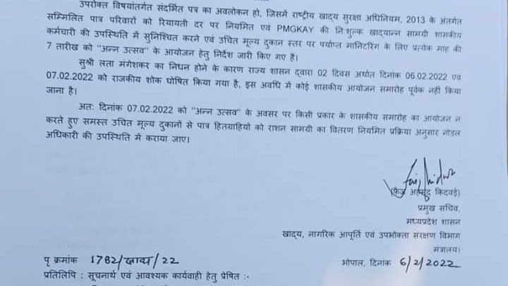 राज्य शासन ने 7 फरवरी को प्रदेश भर की राशन दुकानों मे आयोजित होने वाले अन्न उत्सव के संबंध मे कहा है कि राजकीय शोक के कारण राशन दुकानों मे कोई उत्सव या कार्यक्रम नही किए जायेंगे। बल्कि नियमित प्रक्रिया के तहत हितग्राहियों को खाद्यान्न का वितरण किया जाये।