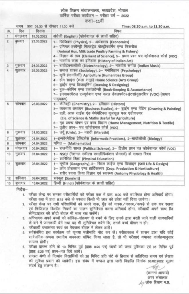 कक्षा नौवीं की परीक्षा 16 मार्च से 12 अप्रैल 2022 और कक्षा 11वीं की परीक्षा 15 मार्च से 13 अप्रैल 2022 तक आयोजित की जाएगी।