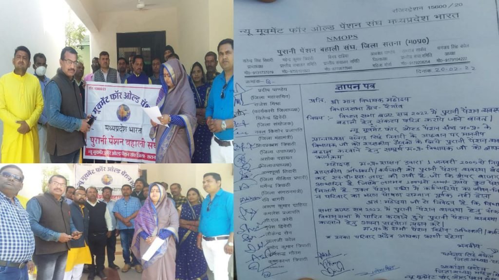 मध्य प्रदेश जिला सतना के अंतर्गत रैगांव विधानसभा में बजट सत्र 2022 में पुरानी पेंशन व्यवस्था बहाली हेतु संकल्प पारित कराए जाने के लिए न्यू मोमेंट फॉर ओल्ड पेंशन संघ के प्रांतध्यक्ष सतेंद्र सिंह तिवारी के आव्हान पर रैगांव विधायक कल्पना वर्मा को ज्ञापन सौंपा गया,ज्ञापन में बताया गया