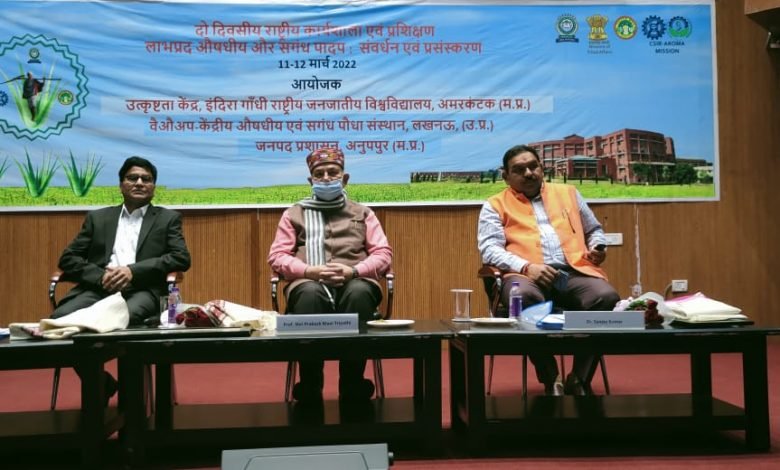मध्यप्रदेश के मुख्यमंत्री शिवराज सिंह चौहान व भारत सरकार के केन्द्रीय वन मंत्री श्री अश्विनी चौबे के मंशा अनुरूप अमरकंटक क्षेत्र के जलवायु अनुरूप औषधीय वनस्पतियों के महत्वपूर्ण केन्द्र के रूप में विकसित करने के उद्देश्य से कलेक्टर सोनिया मीना की पहल पर आयुष, वन, कृषि एवं किसान कल्याण, उद्यानिकी विभाग व मध्यप्रदेश राज्य ग्रामीण आजीविका मिशन और इन्दिरा गांधी राष्ट्रीय जनजातीय विश्वविद्यालय अमरकंटक के समन्वय से स्थानीय कृषकों को औषधीय पौधों के संरक्षण, संवर्धन और प्रसंस्करण के तकनीकी पहलुओं की जानकारी उपलब्ध कराने के उद्देश्य से जिला प्रशासन अनूपपुर, आईजीएनटीयू व सी-मैप के द्वारा दो दिवसीय तकनीकी प्रशिक्षण सह कार्यशाला का आयोजन इन्दिरा गांधी राष्ट्रीय जनजातीय विश्वविद्यालय अमरकंटक के प्रोफेसर लक्ष्मण हवानुर ऑडिटोरियम में आयोजित किया जा रहा है। लाभप्रद औषधि और सगंध पादक के संवर्धन और प्रसंस्करण हेतु आयोजित दो दिवसीय कार्यशाला का शुभारम्भ आईजीएनटीयू के कुलपति प्रोफेसर प्रकाशमणि त्रिपाठी द्वारा किया गया। इस अवसर पर आईजीएनटीयू के उत्कृष्टता केन्द्र के प्रोफेसर पी.के. सामल, राष्ट्रीय औषधि एवं सगंध पौधा संस्थान सी-मैप लखनऊ के प्रमुख वैज्ञानिक डॉ. संजय कुमार सहित संबंधित विभागों के अधिकारी व कृषक उपस्थित थे।