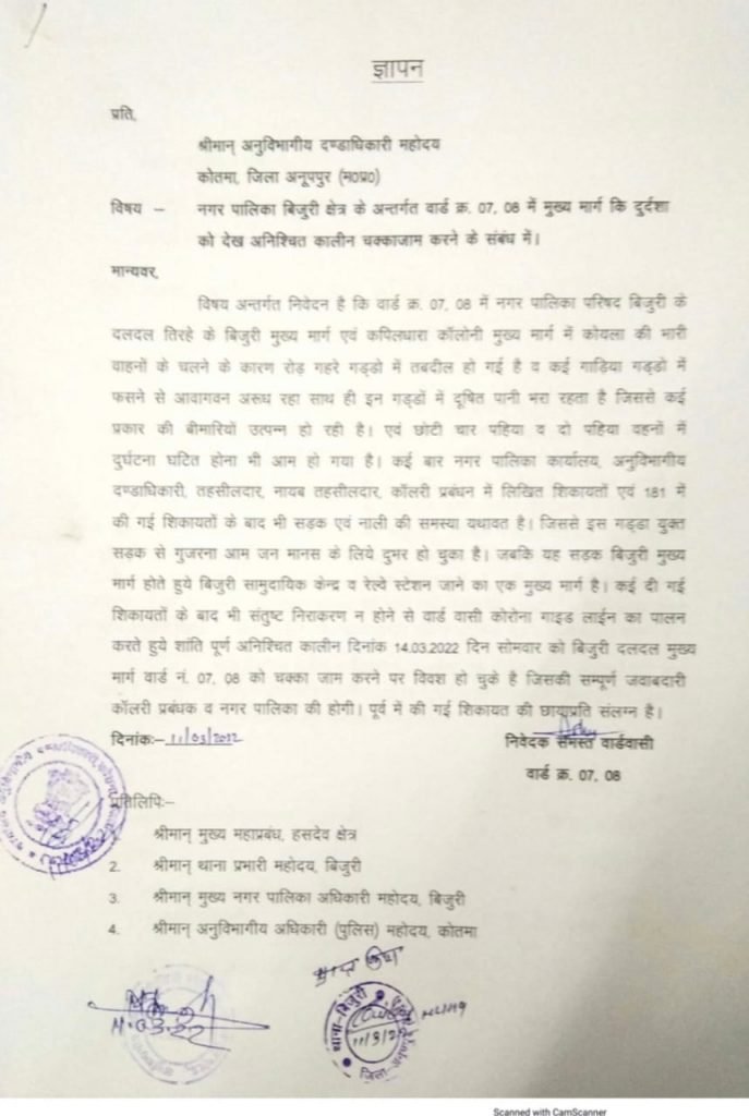 कई बार दी गई शिकायतों के बाद भी संतुष्ट निराकरण न होने से वार्ड वार्ड वासी शांति पूर्ण अनिस्थित कालीन दिनांक 14.03.2022 दिन सोमवार को बिजुरी दलदल मुख्य मार्ग पार्ड नं 07 08 को चक्का जाम करने पर विवश हो चुके हैं जिसकी सम्पूर्ण जवाबदारी कॉलरी प्रबंधक व नगर पालिका की होगी।