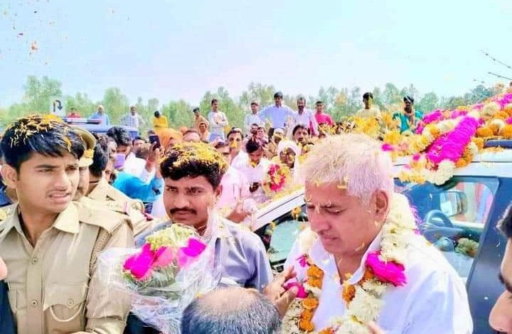 संख्या में क्षेत्रवासी ने स्वागत किया स्वागत में गोला तमाशा डीजे बैंड बाजा एवं बुलडोजर से अगवानी की गई