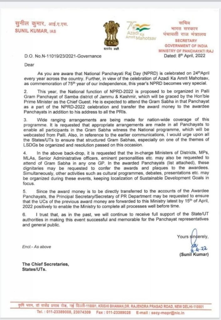 आजादी के अमृत महोत्सव के अंतर्गत राष्ट्रीय पंचायतीराज दिवस पर आयोजित कार्यक्रम में संपूर्ण देश के पंचायत और ग्रामीण क्षेत्र में किए गए कार्यों की रैंकिंग के आधार पर जिला, जनपद, और ग्राम पंचायतों को सम्मानित किया जाएगा।