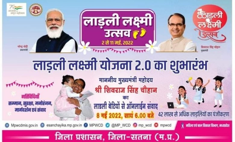 मध्य प्रदेश जिला सतना में 7 मई 2022/को राज्य शासन की सर्वोच्च प्राथमिकता के कार्यक्रम लाडली लक्ष्मी योजना के अंतर्गत प्रदेश भर की 42 लाख से अधिक लाडली बेटियों और उनके अभिभावकों की सक्रिय भागीदारी सुनिश्चित कर 8 मई को प्रदेशव्यापी लाडली उत्सव मनाया जा रहा है।