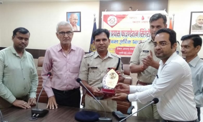 जन प्रयास फाउंडेशन के अध्यक्ष श्री शिवेंद्र पांडे एवं इंडियन रेड क्रॉस सोसायटी ब्लड बैंक प्रभारी डॉक्टर आरडी द्विवेदी ने अतिरिक्त पुलिस अधीक्षक श्री शिव कुमार वर्मा एवं सूबेदार आशीष तिवारी को सम्मान स्मृति चिन्ह भेंट किया।
