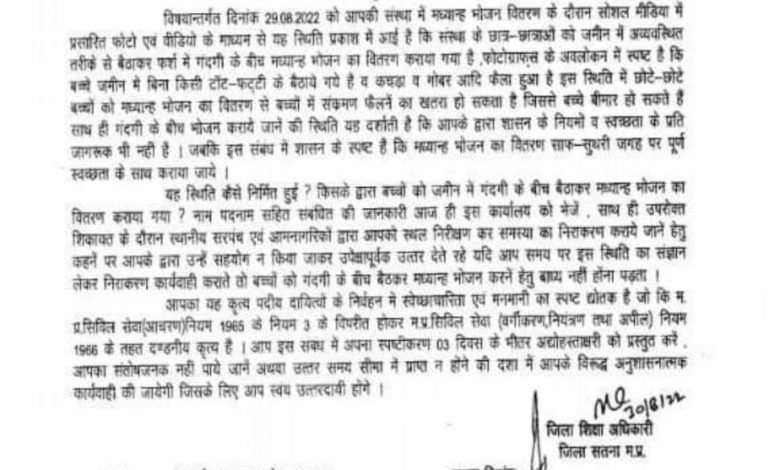 मध्य प्रदेश जिला सतना में 30 अगस्त 2022 को शासकीय उच्चतर माध्यमिक विद्यालय कारीगोही में मध्यान्ह भोजन वितरण के दौरान साफ-सुथरी जगह में स्वच्छता के साथ छात्रों को भोजन नहीं कराने का वीडियो वायरल होने पर प्राचार्य शा.उ.मा.वि. कारीगोही पीडी सोनी के विरुद्ध नोटिस जारी कर 3 दिवस में जवाब चाहा गया है।