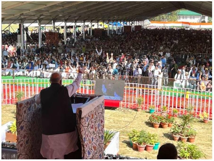 श्री अमित शाह ने कहा कि पहले घाटी के युवाओं के हाथ में पत्थर और बंदूक पकड़ा दी गई थी, लेकिन आज प्रधानमंत्री श्री नरेंद्र मोदी जी ने यहां उद्योग लगाकर युवाओं के हाथ में मोबाइल और लैपटॉप पकड़ाने का काम किया है ताकि युवा रोजगार हासिल कर सकें। गृह मंत्री ने कहा कि दहशतगर्दी से कभी किसी का भला नहीं हुआ, आतंकवाद ने दुनिया में किसी का भला नहीं किया। 1990 से लेकर आज तक जम्मू कश्मीर के 42000 लोग दहशतगर्दी की भेंट चढ़ गए, आतंकवाद की भेंट चढ़ गए। उन्होने कहा कि अब आतंकवाद धीरे-धीरे समाप्त हो रहा है। श्री शाह ने कहा आज हमारे कश्मीर के अंदर हर गांव में बिजली पहुंच चुकी है और मोदी जी ने पाँच लाख रुपये तक पूरा इलाज निशुल्क कर दिया है।