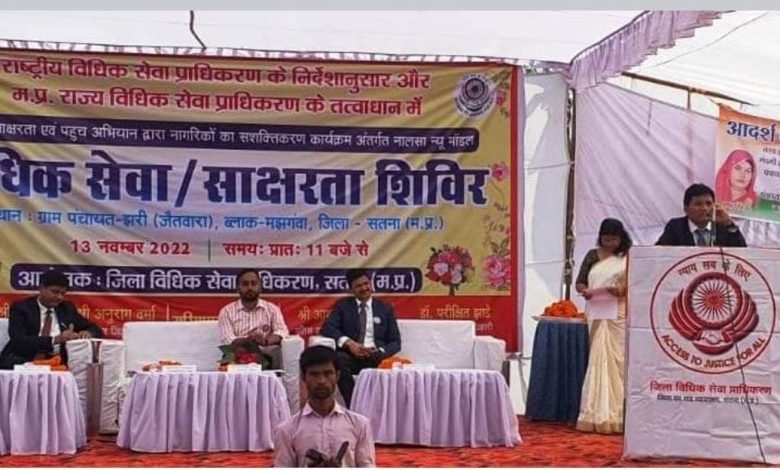 मध्य प्रदेश जिला सतना 13 नवंबर 2022/विधिक साक्षरता एवं पहुंच अभियान अंतर्गत नागरिकों के सशक्तिकरण कार्यक्रम के तहत नालसा माड्यूल अनुसार रविवार को विकासखंड मझगवां की ग्राम पंचायत झरी (जैतवारा) में विधिक साक्षरता तथा केन्द्र एवं राज्य सरकार द्वारा चलाई जा रही जन कल्याणकारी योजनाओं का लाभ आमजन तक पहुंचाने वृहद विधिक साक्षरता एवं सेवा शिविर का आयोजन संपन्न हुआ। वृहद विधिक साक्षरता एवं सेवा शिविर का शुभारंभ प्रधान जिला न्यायाधीश एवं अध्यक्ष जिला विधिक सेवा प्राधिकरण श्री रमेश कुमार श्रीवास्तव ने किया। इस अवसर पर विशेष न्यायाधीश श्री एससी राय, कलेक्टर श्री अनुराग वर्मा, सीईओ जिला पंचायत डॉ परीक्षित झाड़े, एसडीएम पीएस त्रिपाठी, जिला विधिक सहायता अधिकारी सुभाष चौधरी, जिला कार्यक्रम अधिकारी सौरभ सिंह, सरपंच पुष्पा सिंह सहित न्यायिक मजिस्ट्रेट, अधिवक्ता एवं ग्रामीणजन उपस्थित रहे।
