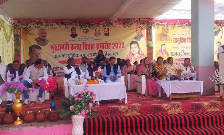 उन्होंने इस अवसर पर पेसा एक्ट के संबंध में भी जानकारी दी। पूर्व विधायक सुदामा सिंह ने कहा कि मुख्यमंत्री कन्या विवाह योजना निःशक्त, निर्धन और कमजोर परिवार की सहायता के लिए आम लोगों की भावना और उनकी भागीदारी को दृष्टिगत रखते हुए प्रारम्भ हुई है। उन्होंने नव दम्पत्तियों को शुभकामनाएं दी। इस अवसर पर अन्य जनप्रतिनिधिगणों ने भी कार्यक्रम को संबोधित किया।