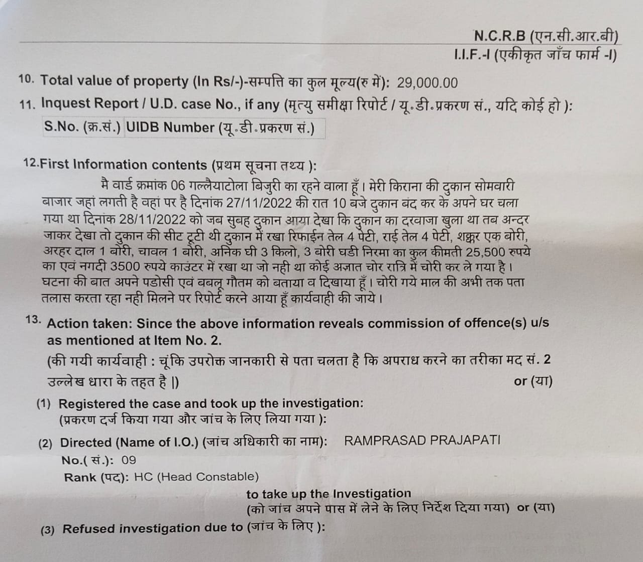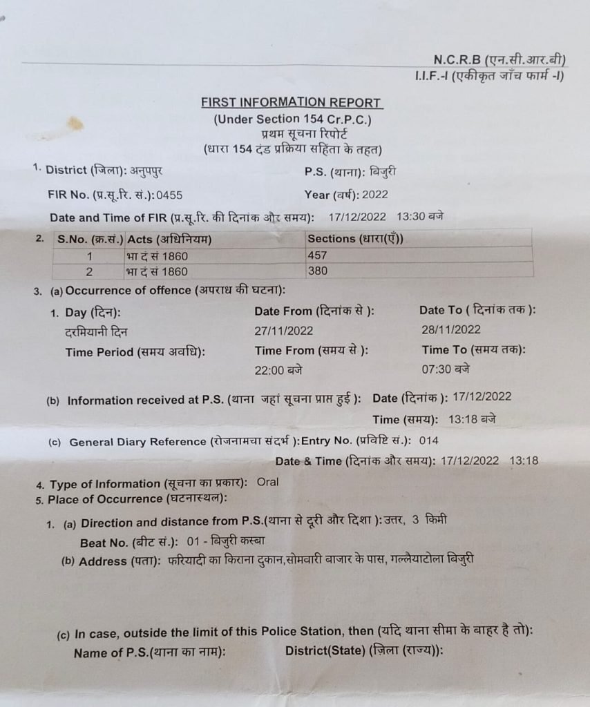किन्तु एफ.आई.आर.दर्ज नहीं की गई, दिनांक 14 जनवरी के दरमियान सुबह 11:00 बजे शिकायतकर्ता अपने ससुराल गया लगभग रात 11:00 जब वह घर लौटा तो उसके घर का ताला टूटा मिला अंदर जाने के बाद दोनों अरमारी का लाकर तोड़ चोरों द्वारा सोने-चांदी के जेवरात सहित एलईडी टीवी पार कर दिया गया, इसी तरह नगारा बांध स्थित डामर प्लांट मे चोरी की घटना सहित सूने घरों सहित लगातार पार्टी में भी चोरी की वारदात घटित हो रही हैं लेकिन बिजुरी पुलिस चोरी की घटनाओं का खुलासा तो दूर लेकिन चोरी रोकने में भी असफल साबित हो रही है जिससे नगर सहित ग्रामीण क्षेत्रों में दहशत का माहौल निर्मित हो रहा है!