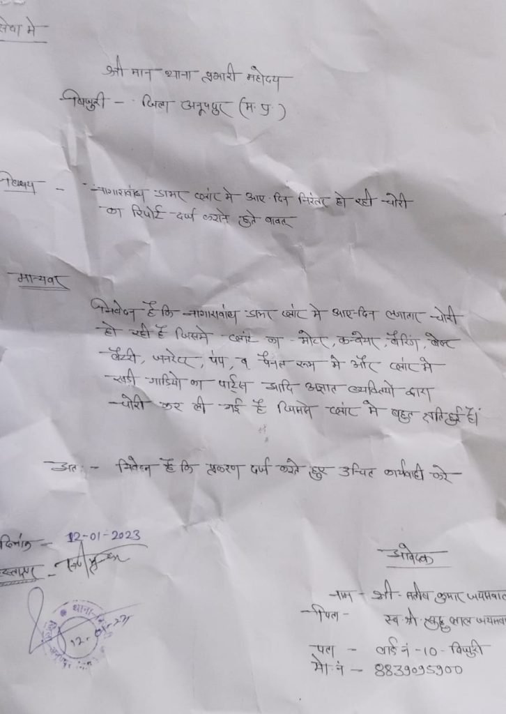 जिसके बाद फरियादी पुलिस अधीक्षक अनूपपुर के पास 16 दिसंबर 2022 को पहुंचा जिसके बाद 17 दिसंबर को अज्ञात चोरों के खिलाफ मुकदमा दर्ज कर दिया जाता है,नंदगांव स्थित सूरजपाव के घर पर 7 जनवरी 2023 की रात चोरों ने करीबन 7 कुंटल के आसपास घर पर रखा थान साथ ही एक एलईडी टीवी व घर पर रखे कुछ कपड़े को चोरों ने अपना निशाना बनाया जिसके बाद नंदगांव स्थित फार्म हाउस में 11 जनवरी व 12 जनवरी के दरमियान अज्ञात चोरों ने घुसकर कमरे की सीट तोड़कर उसमें रखे 200 नग मुर्गी कीमत लगभग 60 हजार सहित परिसर के अंदर गोदाम से पुरानी वाहन के स्क्रैब व अन्य सामान लगभग 1 लाख कीमत का सामान चोरी कर लिया गया, जिसमें बिजुरी थाना में आवेदन लिया गया