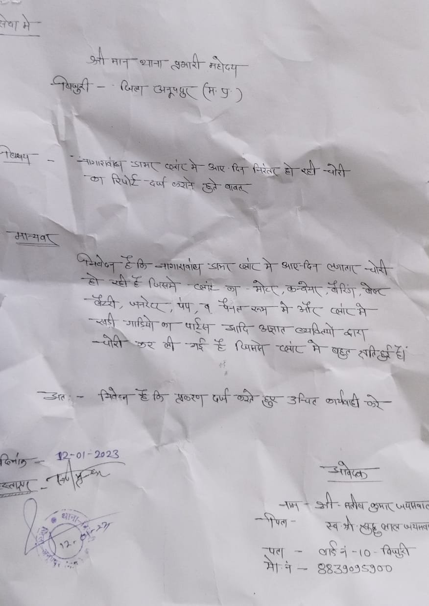 बिजुरी के वार्ड क्रमांक 7 अंतर्गत भालू गुडार में बीते सात आठ महीने पूर्व घर में घुसकर 3 मोबाइल सहित नगदी पैसे चोरो द्वारा पार कर दिया गया वोही माइनस तिराहा में भी बीते 27 नवंबर की रात को कुछ अज्ञात चोरों ने एक किराने की दुकान को अपना शिकार बनाया जिसके फुटेज सीसीटीवी में भी कैद हो गया उसके बावजूद आज तक किसी भी प्रकार की कोई भी कार्रवाई नहीं की गई शिकायतकर्ता के द्वारा बताया गया कि उसके दुकान में 27 नवंबर को रात में चोरी हो गई जिसकी शिकायत थाना में दर्ज कराने के लिए पहुंचा लेकिन उन्हें 19 दिन तक थाने का चक्कर लगाने के बावजूद उसकी शिकायत दर्ज नहीं की जा रही थी