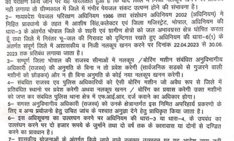भोपाल जिले में 22 अप्रैल 2023 से लेकर 30 जून 2023 तक अशासकीय और निजी नलकूप खनन पर लगाई रोक