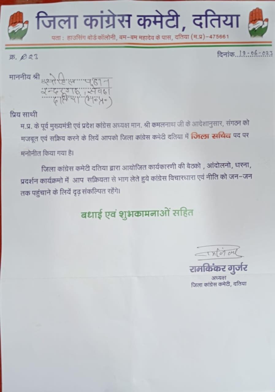 मध्यप्रदेश के दतिया जिला में कांग्रेस पार्टी का जिला सचिव नियुक्त